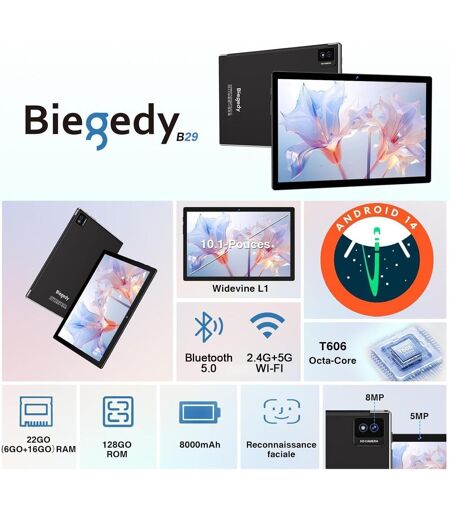 Dernière version d'Android 14 La tablette PC Android est équipée du dernier système Android 14, qui est facile à configurer, rapide et compatible. Il permet non seulement d'améliorer les performances, mais aussi de protéger pleinement la vie privée et la sécurité. La tablette est équipée d'un processeur stable à 8 c?urs d'une fréquence imale de 2,0 GHz, qui améliore la vitesse d'exécution des programmes, rend le système plus réactif et améliore la fluidité de l'expérience de l'utilisateur.22Go RAM + 128Go ROM(1To Extensible)Le B29 tablette a une excellente combinaison de mémoire. 22 go de Ram pour un multitâche amélioré et 128 go de stockage intégré pour tous vos fichiers, photos, vidéos et applications. Qui plus est, le stockage intégré de la tablette peut être étendu jusqu'à 1 to via une carte Micro SD, de sorte que vous n'avez presque pas à vous soucier de l'espace de stockage insuffisant et que vous pouvez stocker plus de photos, de films et d'autres contenus.Wi-Fi 6 & Processeur 8 c?ursBiegedy Tablette à processeur 8 c?urs associe un puissant processeur 8 c?urs à la pr en charge de l'exécution simultanée de plusieurs applications ou jeux volumineux, pour une expérience utilisateur plus fluide.Tablette est équipée de la technologie WiFi 6 couvrant les bandes 2,4 GHz et 5 GHz pour des vitesses de connexion réseau plus rapides, plus sûres et plus économes en énergie.10 Pouces & 5MP+8MP & 8000 mAhTablette est équipée d'un écran tactile de 10,1 pouces d'une bonne résolution HD de 1280*800 avec des couleurs vives et une qualité d'image claire. L'appareil photo HD de 5MP+8MP capture clairement les belles images de la vie.La batterie haute capacité de 8 000 mAh est suffisante pour de longues heures de naviion sur Internet, de visionnage de vidéos, de jeux ou d'autres activités. Widevine L1&Bluetooth; 5.0La tablette B29 prend en charge Widevine L1 pour une image plus claire lorsque vous regardez des films en ligne. Le système avancé à deux haut-parleurs vous plonge dans un son panoramique. Avec le Bluetooth 5.0 intégré, la tablette se connecte aux casques Bluetooth, aux claviers Bluetooth et à d'autres appareils compatibles Bluetooth via le Bluetooth 5.0 pour des connexions plus rapides et plus stables. Profitez de la commodité et du plaisir d'être en mouvement.Wi-Fi double bande + reconnaissance faciale + GPS la tablette Biegedy B29+ Android 10.1 pouces est équipée d'un Wi-Fi double bande (2,4G/5G) intégré, offrant une connexion réseau plus rapide et plus stable. La tablette prend également en charge la fonction de déverrouillage par reconnaissance faciale, permettant un accès rapide. Le port de chargement Type-C et la pr casque 3,5 mm intégrés offrent un confort supplémentaire. La tablette prend également en charge la naviion GPS. Où que vous alliez, la tablette Android Biegedy B29+ 10.1 pouces sera votre meilleure alliée..La livraison depuis la France est prévue dans 5 jours ouvrés, n'hésitez pas à passer votre commande ...