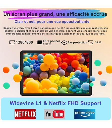 22 Go RAM + 128 Go ROM de mémoireCette tablette équipée d'un puissant espace de mémoire de 22 Go RAM (6 + 16) et 128 Go ROM extensible jusqu'à 1 To, prend en charge la technologie UFS 2.1 pour augmenter considérablement la vitesse de téléchargement. Effectuez des tâches telles que les jeux, le bureau et l'audio sans aucun problème.Puissant processeur Octa-CoreDécouvrez le prochain niveau de performance avec le processeur Unisoc T606, avec des c?urs A75 Performance fonctionnant à 2,0 GHz et des c?urs A55 Efficient. Son GPU Mail-G57 rend les graphismes de jeu plus frais et réalistes. Que vous gériez les tâches quotidiennes ou que vous fassiez un travail de bureau exigeant, le processeur Octa-Core garantit des performances fluides et efficaces à tout moment, vous permettant de vous concentrer sur ce qui compte le plus.Tablette Android 14 la nouvelle tablette Android 14, avec la possibilité de révoquer les autorisations plein écran pour les applications, apportera une foule d'autres nouvelles fonctionnalités et optimisations, en plus de la gestion des autorisations en plein écran, telles qu'une meilleure protection de la vie privée, une gestion plus intelligente des notifications et plus d'options de thèmes pour profiter de performances plus fluides, une meilleure réactivité et une efficacité sans couture.Widevine L1/Netflix HDLe Widevine L1 offre le plus haut niveau de sécurité. Le contenu est déchiffré à l'intérieur de l'appareil et protégé par du matériel qui empêche la fuite des données d'origine. Pendant ce temps, Widevine est largement utilisé sur Hulu, Prime Video, Netflix, YouTube et de nombreux autres services de streaming.Résolution d'écran HD cet ordinateur plat de 10,1 pouces est configuré avec une résolution HD de 1280 x 800 pixels, ce qui offre un écran lumineux, coloré et agréable pour les yeux qui vous permet de profiter des activités de loisirs avec une fluidité exceptionnelle. Vous plongerez dans un monde fascinant même en plein soleil et dans l'obscurité.Batterie longue durée de 8 000 mAh cette tablette est équipée d'une batterie de 8 000 mAh, vous permettant de passer moins de temps à charger et plus de temps sur les tâches, idéale pour un travail productif tout au long de la journée.Appareil photo 8MP + 5MPCapturez des images étonnantes avec la caméra arrière de 8 MP et profitez d'appels vidéo nets avec la caméra frontale de 5 Mpx. Que vous preniez des photos ou que vous participez à un chat vidéo, le TAB20 vous garantit une qualité visuelle et une clarté supérieures.5G WiFi & BT 5.0La tablette est équipée d'une fonction 5G WiFi et Bluetooth 5.0, qui vous permet de vous connecter rapidement au monde numérique et d'améliorer votre efficacité au travail. La tablette comprend TAB20, souris, clavier Bluetooth, adaptateur OTG, étui de protection, chargeur, carte SD, protecteur d'écran, etc. Vous pouvez configurer la tablette comme un petit ordinateur portable..La livraison depuis la France est prévue dans 5 jours ouvrés, n'hésitez pas... ...