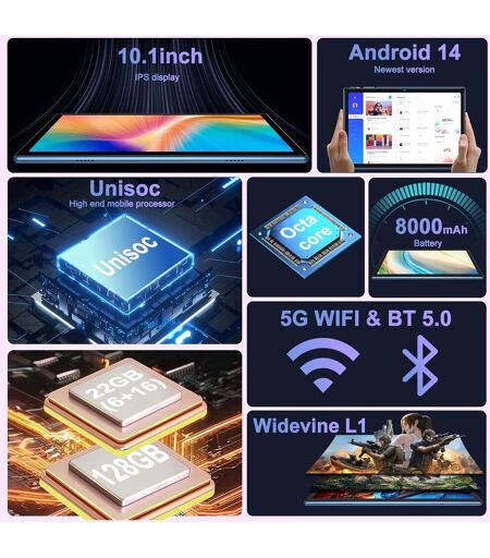 Tablette 2025 Nouvelle Tablettes 10 Pouces Android 14 Avec 22Go Ram 128Go Rom 5G+2.4G Wifi,Gps,Octa-Core 2.0Ghz,Gms,8000Mah,Widevine L1,Bt5.0,Tablette Tactile Avec Claviersourisetui-Bleu