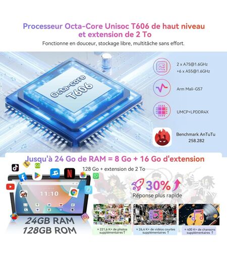 Blackview Tablette Android 15La tablette Blackview Tab 60 Pro est équipée du tout dernier système dexploitation Android 15, offrant une interface plus fluide et esthétique. Cette nouvelle version apporte également une série de nouvelles fonctionnalités, renforce la protection de la vie privée et rend la Blackview Tab 60 Pro plus intelligente et plus adaptée à votre quotidien.24 GO RAM + 128 GO Grand Stockage & Processeur Octa-coreCette tablette Android15 de 10 pouces est équipée de 24 Go de RAM (8 Go de RAM + 16 Go de ROM extensible) et de 128 Go de ROM, offrant une expérience fluide pour vos activités quotidiennes. Vous pouvez étendre la capacité jusquà 2 To avec une carte TF pour stocker tous vos contenus préférés. De plus, la tablette tactile Blackview est dotée du processeur octa-core Unisoc T606, capable dexécuter des jeux intensifs avec des performances optimales.Les Tablette 10 pouces avec Widevine L1La tablette Blackview de 10 pouces est équipée dun écran intelligent IPS haute définition offrant une qualité dimage exceptionnelle et un angle de vue plus large. Avec la certification WideVine L1, vous pouvez accéder à davantage de contenu en streaming HD sur Google Play, Netflix, YouTube, Hulu et Prime Video. Cette tablette est dotée de deux haut-parleurs stéréo pour une expérience audio 3D immersive, en même temps que trois modes de protection oculaire protègent vos yeux lorsque vous regardez des films.Grande Batterie de 7700 mAh + Double CamérasLa tablette Blackview Tab60 Pro est équipée dune batterie de 7700 mAh offrant une autonomie prolongée, vous permettant de voyager, détudier ou de vous divertir sans craindre une panne dénergie. Cette tablette Android 15 est dotée de deux caméras pour des pr s de vue nettes et détaillées, ainsi que de la fonction de reconnaissance faciale et de lobjectif intelligent Google pour faciliter les scans, la recherche dobjets et lextraction de contenu.Connexion rapide et expérience sensible fluideLa tablette Android 15 prend en charge deux cartes SIM 4G LTE et le WiFi double bande 2,4 GHz/5 GHz, en tant que tablette de jeu intégrant communication et WiFi. Avec le Bluetooth 5.0, elle peut se connecter rapidement et de manière stable à différents appareils Bluetooth. Grâce au support du GPS+Glonass+Beidou+Galileo par la tablette tactile Blackview, elle offre également une localisation préc .Des tablettes Android 15 plus puissantesLa tablette tactile Blackview Tab 60 Pro, avec une épaisseur de seulement 8,5 mm et un poids de 543 g, est facile à tenir dune seule main. Elle propose une gamme de nouvelles fonctionnalités et améliorations telles que le multi-fenêtrage, partage partiel de l'écran, la barre des tâches fixe, une gestion intelligente des notifications, ainsi que davantage doptions de design. Blackview offre une garantie de 2 ans et un support technique à vie pour vous assurer un achat sans.La livraison depuis la France est prévue dans 5 jours ouvrés, n'hésitez pas à passer votre commande ...