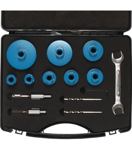 Pour le perçage de carrelages, de granit et de marbre Contenu : Couronnes diamantées de 20, 25, 35, 38, 42, 52, 65, 75 mm de Ø, adaptateurs M14/HEX, M14/SDS, clé à six pans creux, 2 forets à centrer, clé d’ouverture 19 Livraison dans une mallette Autres caractéristiques techniques: · Contenu: 14 pcs. Hauteur 85,000 Convient pour Fliesen / Granit / Marmor Largeur 265,000 Longueur 330,000 Poids 2530,000 Logement M14 Taille de l'emballage 1.00 ...