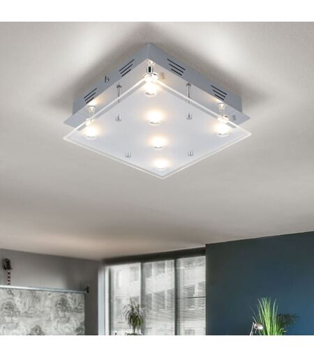 Description Plafonnier au design élégant pour tous les espaces de vie imaginables. Grâce au style classique de ce charmant plafonnier, il s'intègre dans presque tous les types d'ameublement et leur confère une atmosphère de bien-être absolue. Grâce à l'utilisation de matériaux plutôt discrets et à la forme peu spectaculaire en forme de losange, cette lampe n'est liée à aucun espace lors de son utilisation. Fabriquée en métal et en verre, cette lampe impressionne avant tout par sa fonctionnalité et sa luminosité. Six ampoules LED COB sont installées en permanence dans le luminaire. Détails lampe • Type de lampe : plafonnier • Matériau : métal, verre • Acier brossé, blanc satiné • Longueur x largeur x hauteur en cm : 30 x 30 x 8 • Source lumineuse : LED COB • Ampoules incluses : Oui (installées en permanence) • Puissance de la lampe : 6 x 3 watts • Flux lumineux : 6x 210 lumens • Couleur de la lumière : blanc chaud • Alimentation : 230 V, 50 Hz Détails des ampoules • Technologie : ...