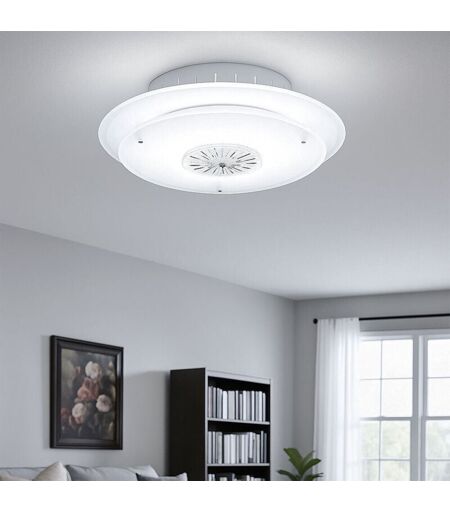 Description Cet élégant plafonnier convainc par l'alliance de la fonction et du design. Sa structure plate d'un diamètre de 33 cm en fait le choix idéal pour les pièces dont la hauteur de plafond est limitée. La combinaison de verre satiné, de métal chromé et d'un élément central en cristal crée un équilibre harmonieux entre discrétion et glamour. La douille R7s permet d'utiliser des ampoules à puissance variable - tu détermines la couleur de la lumière et la luminosité selon tes souhaits. Les structures cristallines claires reflètent la lumière avec effet et créent une ambiance élégante. Que ce soit dans le couloir, le salon ou la chambre à coucher - ce luminaire attire discrètement le regard avec un effet lumineux particulier. L'ampoule n'est pas comprise dans la livraison. Détails du luminaire • Type de lampe : plafonnier • matériaux : métal, chrome, cristal/verre • Abat-jour : satiné, transparent • Type de protection : IP20 • Diamètre x hauteur en cm : 33 x 8,5 • Douille : 1x R7s ...