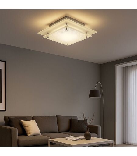 Description Un plafonnier au design élégant pour tous les espaces de vie imaginables. Grâce au style classique de ce ravissant plafonnier, il s'intègre dans presque tous les types d'intérieurs et leur confère une atmosphère de bien-être absolu. Grâce à l'utilisation de matériaux plutôt discrets et à sa forme carrée peu spectaculaire, cette lampe n'est liée à aucune pièce dans son utilisation. Fabriquée en métal et en verre, cette lampe convainc en premier lieu par sa fonctionnalité. L'ampoule n'est pas comprise dans la livraison. Détails de la lampe • Type : Plafonnier • Matériau : métal laqué • Abat-jour : Verre • Longueur x largeur en cm : 22x22 • Douille : 1x G9 • Ampoule incluse : Non • Puissance de l'ampoule : max. 1x 42 Watt• Alimentation électrique : 220-240V, 50-60Hz ...