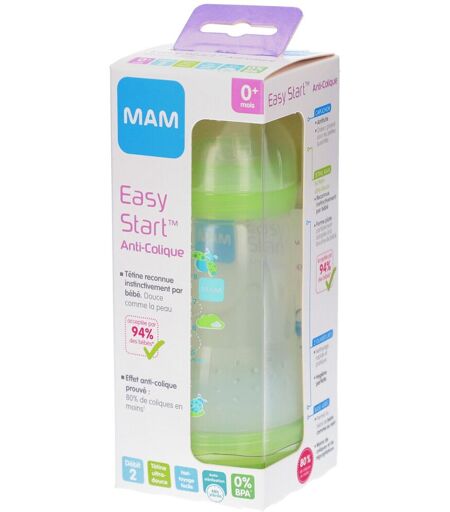 Avec le Biberon anti-colique, les bébés se sentent bien dès le premier jour. Ils n'avalent pas d'air en buvant. Facilite le passage de maman au biberon.Utilisation aiséeLe bouchon anti-fuite est idéal pour un bébé plein d’entrain jour après jour.TétineTétine douce comme la soie, au toucher moelleux, inégalable.Design fonctionnelLarges ouvertures permettant un remplissage facile et un nettoyage particulièrement aisé.Fond ventiléLe fond ventilé aide à diminuer les coliques en réduisant l’ingurgitation d’air.BénéficesBase aérée pour le bien être de bébéLa base brevetée du Biberon anti-colique permet au bébé de boire comme au sein grâce aux petites aérations de la base. Fini les bulles d’air et les interruptions. Le débit de lait reste constant. Le rythme est naturel. C‘est prouvé : une étude montre que le biberon anti-colique de MAM réduit les coliques pour 80% des bébés*. Les bébés se sentent mieux, détendus et ça se voit, surtout la nuit.* Effet prouvé : 80 % de coliques en moins !Tétine reconnue instinctivement par bébéDouce comme la peau de maman grâce à sa surface, la tétine MAM offre une sensation familière à bébé. Ainsi, elle est reconnue instinctivement par bébé. C’est prouvé: 94% des bébés acceptent la tétine MAM **.(** étude de marché 2008-2010, testé sur 995 bébés.)Fonction auto stérilisanteStériliser votre biberon ? Rien de plus simple avec le biberon MAM. En simplement trois étapes le biberon se stérilise aux micro-ondes. Rapidement et sans avoir besoin d'un accessoire comme le stérilisateur.Conseils d'utilisationUtilisez toujours ce produit sous la surveillance d'un adulte. N'utilisez pas les tétines comme des sucettes. Une tétée prolongée de liquides peut nuire aux dents. Avant de servir, contrôlez systématiquement la température de la boisson. Gardez l'ensemble des éléments hors de portée des enfants.ConditionnementBiberon 260ml x1 ...
