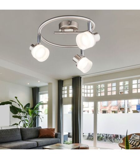 Description Plafonnier élégant au design rond. Ce luminaire peut être utilisé dans de nombreux domaines. Que ce soit comme plafonnier dans le couloir, le salon ou la cuisine, ce luminaire s'intègre parfaitement dans tous les espaces de vie. La technologie LED intégrée assure également une lumière agréable et non éblouissante. Trois ampoules LED sont installées en permanence dans la lampe. Détails de la lumière • Type de lampe : Plafonnier • Matériau : Chrome, nickel mat • Abat-jour : Acrylique, transparent • Spots mobiles • Diamètre x hauteur en cm : 26x13,9 • Source lumineuse : 3x LED • Source lumineuse installée en permanence • Puissance de la source lumineuse : 3x 3,5 watts • Flux lumineux : 3x 190 lumens • Couleur de la lumière : blanc chaud • Alimentation : 220-240 V, 50-60 Hz Détails de la source lumineuse • Type de source lumineuse : LED • Culot : carte LED • Flux lumineux : 190 lm (lumens) • Consommation d’énergie : 3,5 kWh/1 000 h • Température de couleur : 3 000 K (Kelvin) • ...