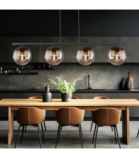 la description Cette beauté noire impressionne par son design élégant. Les verres de couleur fumée, qui sont situés sur une barre, pendent 120 cm dans la pièce. Grâce aux douilles E27, un libre choix de source lumineuse est possible. Cette lampe suspendue est idéale pour les chambres et les salons. D'autres modèles de cette série complètent votre espace de vie. La source lumineuse n'est pas comprise dans la livraison. Détails lampe • Type de lampe : suspension • Matériau : métal, noir mat • Abat-jour : verre, couleur fumée • Longueur x largeur x hauteur en cm : 90 x 15 x 120 • Prise : 4x E27 • Ampoules incluses : non • Ampoules de puissance : 4 x 40 watts max. • Alimentation : 230 V, 50 Hz ...