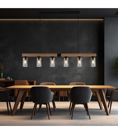 Globo Suspension aspect bois lampe de table à manger 6 flammes suspension salon, verre fumé métal noir, 6x E27, LxH 140x120 cm