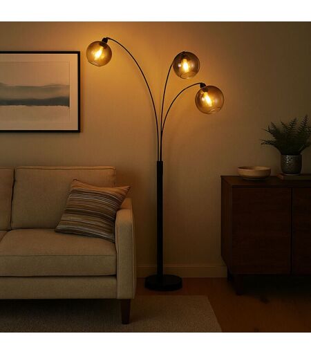 Globo Lampadaire 3 flammes Lampadaire arqué verre fumé Lampe de salon sur pied noir, métal, 3x E27, LxH 105 x 200 cm