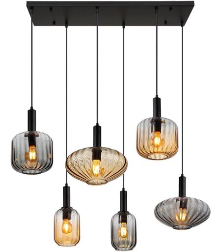 Détails • suspension métal noir mat • verre • c&;ble PVC noir • différentes formes de verre • couleurs de verre : 3 x ambre • 3 x couleur fumée • LxlxH : 1000x470x1500mm • 3 x ambre D : 30/20/14cm • 3 x couleur fumée D : 30/20/14cm • excl .6x E27 60W 230V • différentes formes de verre • couleurs de verre : 3 x ambre • 3 x couleur fumée • matériau de la lampe : métal noir mat • matériau de l'abat-jour : verre • nombre de bases : 6 • Type de douille : E27 • Puissance : 60,00W (watt) • Tension : 230,00V (volt) • Matériau : métal • Couleur : noir mat • Dimensions HxLxL : 150cm x 47cm x 100cm ...