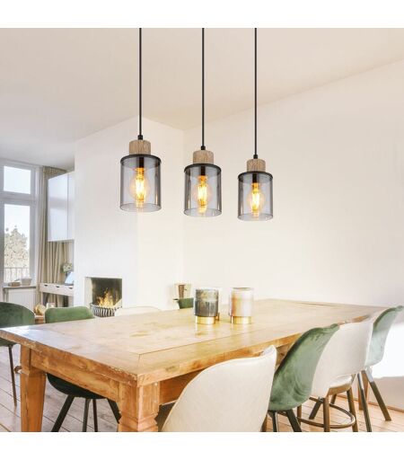 Globo Suspension lampe de table à manger suspension salon 3 flammes, métal noir bois brun verre fumé, 3x E27, LxH 55x 120 cm