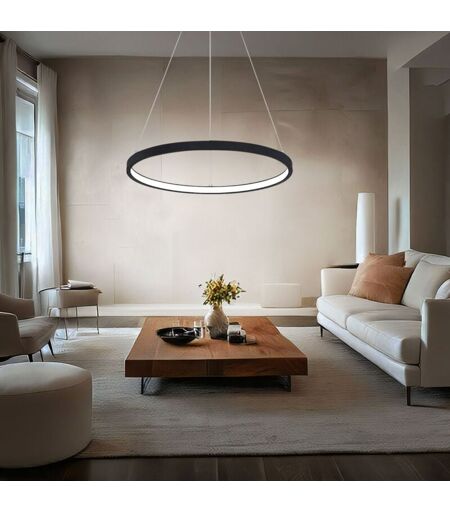 Description Avec cette suspension LED ronde et moderne (Ø 38,5cm) en noir mat, vous êtes sûr d'attirer tous les regards. L'ampoule LED de 19 watts incluse fournit une lumière de 800 lumens et fait briller votre maison d'une lumière blanche chaude (3000K). Le luminaire intérieur à LED s'intègre parfaitement dans le salon/salle à manger et le couloir. D'autres modèles de cette série permettent d'embellir l'espace de vie. Grâce à sa faible consommation d'énergie, cette lampe LED est économe en énergie et donc très écologique. Détails de la lampe • Type de lampe : lampe à suspendre• Matériaux : plastique, métal• Couleur : noir mat, opale• Forme : Anneau• Diamètre x hauteur en cm : 38,5 x 120 • Douille : 1x LED (fixe)• Ampoule incluse : Oui• Puissance de l'ampoule : 1x 19 watts• Flux lumineux : 1x 800 lumens• Couleur de lumière : blanc chaud-Tension : 230V, 50Hz Détails de l'ampoule • Type d'ampoule : LED • Flux lumineux : 800 lm (lumens) • Consommation d'énergie : 19 kWh/1000h • ...