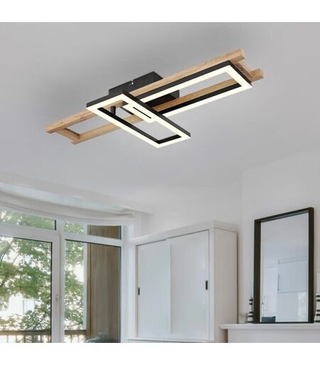 Globo Plafonnier led plafonnier carré en bois chambre salon lampe, 1 rectangle orientable, métal noir, 20W 850lm 3000k, LxH 69x10,5 cm