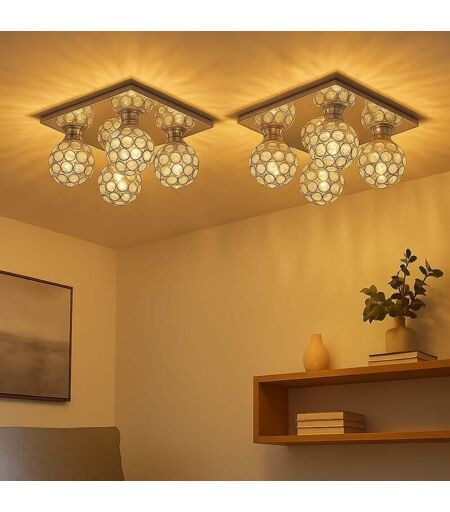 Description Ce plafonnier à 4 flammes allie des éléments métalliques à des cristaux acryliques brillants et crée ainsi d'élégants accents lumineux dans la pièce. Le décor de cristal crée des reflets fascinants et une ambiance raffinée. Avec ses dimensions de 23x23x13,2 cm, elle est compacte mais efficace et convient particulièrement aux salons, salles à manger, couloirs ou chambres à coucher. Équipée de quatre douilles G9, elle peut accueillir des ampoules jusqu'à 33 watts (non incluses), ce qui permet de déterminer individuellement l'intensité lumineuse. Le boîtier métallique robuste combiné aux éléments en cristal richement détaillés fait de ce luminaire un objet d'aménagement durable et stylé. Deux lampes sont comprises dans la livraison ! Détails du luminaire • Type de lampe : plafonnier • Matériau : métal • Abat-jour : Cristaux acryliques • Type de protection : IP20 • 4 flammes • Décor cristal • Longueur x largeur x hauteur en cm : 23x23x13,2 • Douilles : 4x G9 • Ampoules ...