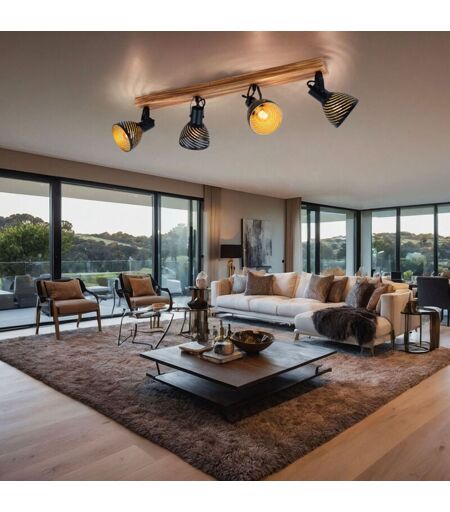 Description Ce spot de plafond (80x12,5 cm) s'intègre à merveille dans l'ambiance de différents styles d'intérieur. Il se compose d'une poutre en bois brun foncé dotée de quatre abat-jour pivotants en métal noir avec des poinçons en forme de ligne. Celles-ci sont teintées dorées à l'intérieur et peuvent être équipées d'ampoules E27 de votre choix, vous donnant la possibilité de déterminer individuellement la couleur et la luminosité de la lumière. Vous pouvez compléter l'ensemble de vos quatre murs avec d'autres modèles de la même série. Les ampoules ne sont pas incluses dans la livraison. Détails lampe • Type de lampe : plafonnier • Matériau : métal, bois • Couleur : noir, or • Classe de protection : IP20 • Classe de protection : 1 • Spots mobiles • Longueur x largeur x hauteur en cm : 80x12,5x25 ...