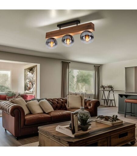Globo - Plafonnier pour chambre à coucher, spot de plafond aspect bois, plafonnier à 3 lampes, verre fumé, métal mdf, 3 douilles E27, LxH 65 x 28 cm