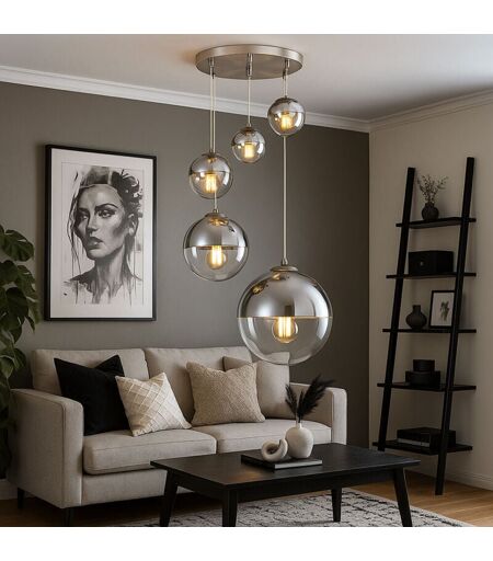 Description Cette lampe à suspendre moderne séduit par son aspect magnifique. Le diamètre de l'élément de plafond rond est de 65 cm, sur lequel se trouvent cinq boules de verre de différentes tailles. La partie supérieure de la boule de verre est en chrome. Grâce à son design, elle attirera à coup sûr tous les regards dans le salon ou la chambre à coucher. Vous pouvez très bien combiner cette suspension avec d'autres articles de cette série. Détails de la lampe • Type de lampe : lampe à suspendre• Matériau : nickel mat • Abat-jour : verre, transparent chrome • Diamètre des boules : 2x15 cm, 1x20 cm, 1x25 cm, 1x33 cm • Diamètre du socle en cm : 65 • Hauteur en cm : 150 • Douilles : 5x E27 • Ampoules incluses : Oui • Puissance de l'ampoule : 5x 3 watts• Flux lumineux total : 1250 lm (5x 250 lumens)• Couleur de lumière : blanc chaud • Alimentation électrique : 220-240V, 50-60Hz Détails de l'ampoule • Type d'ampoule : SMD LED • Culot : E27 • Forme de construction : sphère • Matériau : ...