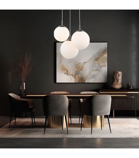 la description Lampe à suspension avec trois sphères en verre de différentes tailles. Grâce à son design moderne, cette lampe peut être intégrée dans presque tous les espaces de vie. Les quatre abat-jour en verre satiné, suspendus à différentes hauteurs, diffusent une lumière agréable et non éblouissante. Équipées de trois douilles E27, des lampes d'une puissance maximale de 60 watts chacune peuvent être utilisées dans la lampe pour assurer un éclairage optimal. Les ampoules ne sont pas comprises dans la livraison. Lampe de détail • Type de lampe : suspension • Matériau : nickel satiné • Abat-jour : verre, dépoli (3 boules de tailles différentes) • Diamètre boule en cm : 1x 20, 1x 25, 1x 30 • Diamètre total x hauteur en cm : 51,5 x 80 • Douilles : 3 x E27 • Ampoule incluse : Non • Puissance de la lampe : 3 x 60 watts maximum • Alimentation : 220-240 V, 50-60 Hz ...
