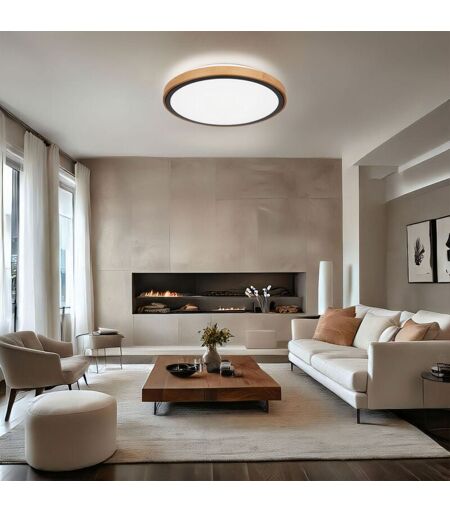 Description Ce plafonnier rond impressionne par son superbe design. Il y a un panneau LED avec des cadres métalliques supplémentaires dans un cadre en bois d'un diamètre de 43,7 cm. Celui-ci peut être atténué et fixé dans les niveaux de lumière 3000 Kelvin blanc chaud, 4500 Kelvin neutre et 6000 Kelvin blanc froid. La source lumineuse est installée en permanence dans la lampe. Détails lampe • Type de lampe : plafonnier • Matériau : métal, acrylique, bois • Couleur : noir, opale, marron • Classe de protection : IP20 • Classe de protection : 1 • Circuit CCT (3 000/4 500/6 000 Kelvin) • Diamètre x hauteur en cm : 43,7 x 11 • Source lumineuse : 1x LED • Lampes installées en permanence • Puissance de la lampe : 1x 24 watts • Flux lumineux : 1x 1000 lumens • Couleur de la lumière : blanc chaud - blanc neutre - blanc froid • Tension : 230 V, 50 Hz Détails des ampoules • Type d'ampoule : LED • Flux lumineux : 1000 lm (lumens) • Consommation d'énergie : 24 kWh/1000h • Température de couleur : ...