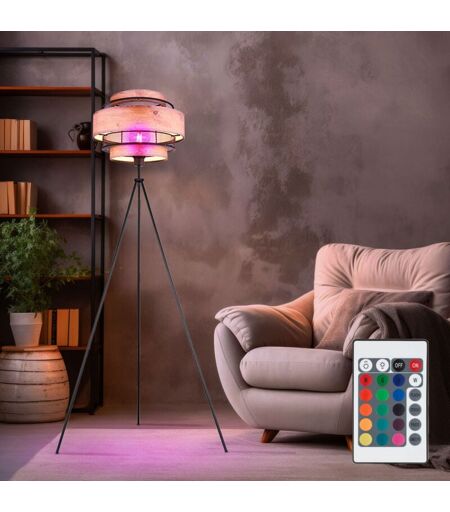 Description Ce superbe lampadaire séduit par son design simple. Une douille E27 d'une hauteur de 1,5m sort d'un trépied en métal noir mat. La douille E27 est équipée d'un bel abat-jour en grille métallique et de décorations en imitation bois (Ø60cm). Au moyen de la télécommande fournie, l'ampoule LED RGB peut être réglée sur différentes couleurs et assure ainsi un éclairage d'ambiance. Une ampoule LED RGB avec télécommande pour le contrôle de la lumière blanche et RGB est comprise dans la livraison. Détails du luminaire • Type de lampe : lampadaire • Matériaux : métal, MDF • Couleur : noir mat, aspect bois • Interrupteur à câble • Type de protection : IP20 • classe de protection : 2 • Longueur du câble en cm : 180 • Diamètre de l'abat-jour en cm : 40 • Diamètre x hauteur totale en cm : 60 x 150 • Douille : 1x E27 • Ampoule incluse • Puissance de l'ampoule : 1x 4 watts • Flux lumineux : 1x 470 lumens • Couleur de lumière : blanc chaud + RGB • Alimentation électrique : 230V, 50Hz ...