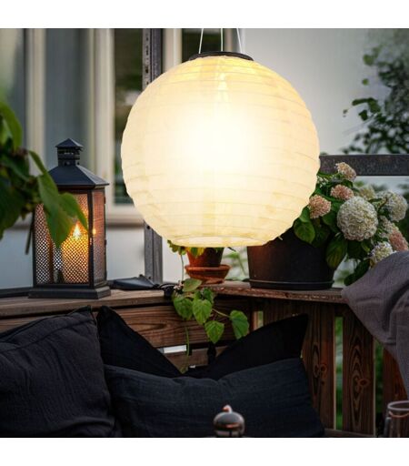 Description Cette lampe solaire en forme de lampion de couleur sable apporte une atmosphère chaleureuse et accueillante dans votre jardin ou sur votre terrasse. Avec un diamètre de 30 cm et un élégant corps en plastique de couleur sable combiné à des éléments en acier inoxydable, cette lampe s'intègre parfaitement dans tout environnement extérieur. Le lampion est équipé d'un interrupteur coulissant pratique qui permet d'allumer et d'éteindre l'éclairage à volonté. La lampe solaire est rechargée par le soleil et ne nécessite aucune source d'énergie externe. Avec un indice de protection IP44, elle résiste aux intempéries et est idéale pour une utilisation en extérieur. La LED intégrée assure une ambiance lumineuse agréable avec une température de couleur de 2700K. Cette lampe solaire est une solution élégante pour un éclairage d'ambiance dans le jardin, sur le balcon ou la terrasse. L'ampoule est intégrée dans le luminaire. Détails de la lampe • Type de lampe : lampe solaire à ...