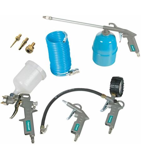 DESCRIPTION: Kit de 8 outils pneumatiques Comprend: 1 soufflette courte 1 gonfleur de pneus SD 3 embouts de gonflage 1 pistolet à peinture 1 pistolet pulvérisateur 1 tuyau en spirale ...