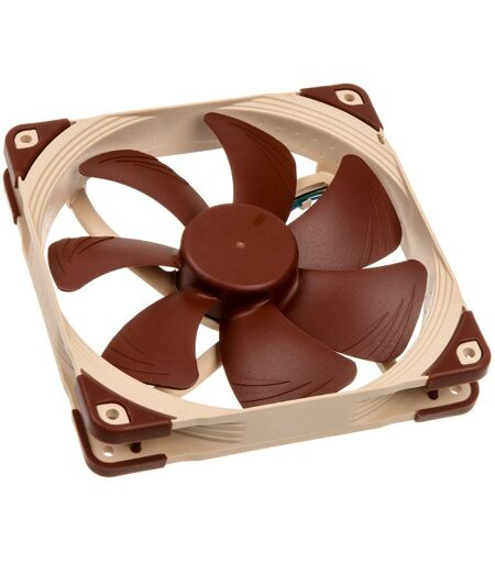 Noctua NF-A14. Type: Ventilateur, Diamètre du ventilateur: 14 cm, Vitesse de rotation (min): 300 tr/min, Vitesse de rotation (max): 1500 tr/min, Niveau de son (vitesse rapide): 24,6 dB, Flux d'air: 140,2 m³/h, Pression d'air maximale: 2,08 mmH2O, Type de roulement: Self-Stabilising Oil-pressure Bearing (SSO). Tension: 5 V. Largeur: 140 mm, Profondeur: 25 mm, Hauteur: 140 mm. Couleur du produit: Beige, Marron ...