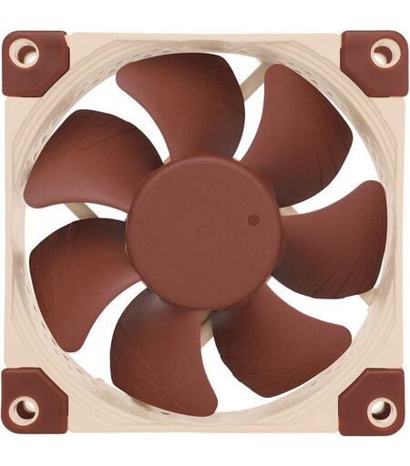 Noctua NF-A8. Type: Ventilateur, Diamètre du ventilateur: 8 cm, Vitesse de rotation (min): 450 tr/min, Vitesse de rotation (max): 2200 tr/min, Niveau de son (vitesse rapide): 17,7 dB, Flux d'air: 55,5 m³/h, Pression d'air maximale: 2,37 mmH2O, Type de roulement: Self-Stabilising Oil-pressure Bearing (SSO). Tension: 5 V. Largeur: 80 mm, Profondeur: 25 mm, Hauteur: 80 mm. Couleur du produit: Beige, Marron ...