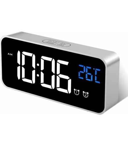 【Luminosité et Sonore Ajustable】Un horloge digitale dont la lumiere ne gene pas la nuit. 4 niveaux différents de luminosité et 3 options de sonore peut être ajustée manuellement. Ecran à LED: 14cm*6cm (5.5*2.4in). l'heure (au format 12 heures ou 24 heures) et la température (° C / ° F). 【USB Charge Alarm Clock】Réglage est très facile et aisément transportable. Ce reveil LED se branche soit sur secteur directement ou sur un port USB, une pile est également fournie pour sauvegarder les réglages en cas de coupure de courant. Lorsque la batterie est faible, un indicateur d’avertissement rouge appara?t à l’écran. 【2 Alarme avec Snooze】 Il une belle horloge numérique aver Température et un miroir à dispositio. Deux alarmes permettent de régler deux heures de réveil distinctes, si vous ne voulez pas de réveil le week-end, il suffit de le mettre sur off. Snooze Fonction: 5min. Mise à l'heure et réglage de la sonnerie en toute simplicité. les 13 différentes sonneries au choix! et peut régler ...