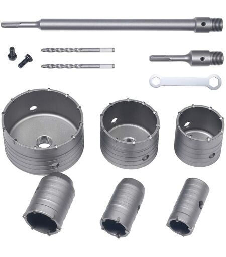 IKODM Scie à Cloche Trépan, Set de Scies Cloches, 10 pcs Trépan Béton sds Tige d'Extension Pointe en Carbure de Tungstène- Ø35mm, 40mm, 50mm, 65mm, 80mm et