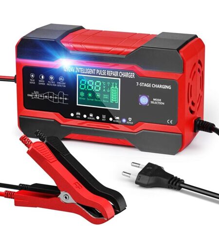 Large plage d'utilisation : Le courant de sortie du chargeur voiture est de 12 V 10 A et 24 V 5 A, convenant parfaitement aux batteries plomb-acide de 12 V 2 Ah à 150 Ah / 24 V 2 Ah à 100 Ah (AGM, GEL, EFB), ainsi qu'aux batteries à eau et aux petites batteries au plomb. Ce chargeur s'applique à la majorité des voitures et motos. L'usage de batteries au lithium est strictement prohibé Modes de sélection variés : Le chargeur offre 5 modes : Standard : Adapté aux batteries au plomb classiques ; AGM/GEL : Conçu pour les batteries AGM/GEL/EFB ; Eau : Approprié pour les batteries à eau et les petites batteries au plomb ; Moto : Convient à tous les types de motos et aux batteries au plomb-acide ; Réparation : Utilisé pour réparer les batteries inactives depuis longtemps ou celles qui ne peuvent pas être chargées Affichage numérique : Le chargeur automatique est équipé d'un écran LCD vous offrant une clarté optimale pour surveiller diverses données pendant le processus de charge. Ces ...