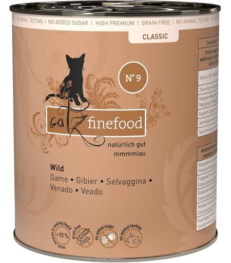 Catz finefood Développé par des experts en nutrition et des vétérinaires notre nourriture humide est un aliment complet avec un mélange optimal de nutriments et de vitamines, adapté aux besoins de votre chatCatz finefood Le n° 9 contient beaucoup de gibier délicat (70 %) et des ingrédients précieux tels que les canneberges et le romarin. Garanti sans conservateurs, sans exhausteur de goût et sans colorantsExtra de viande les chats sont carnivores et ont besoin de protéines animales, c'est pourquoi notre nourriture gourmet à haute teneur en viande est composée de viande et d'abats de qualité alimentaire de qualité supérieureFabriqué en Allemagne la viande provient principalement de producteurs régionaux, elle est traitée à l'état frais et conserve presque complètement les ingrédients grâce à une cuisson douce à la vapeurAdapté aux espèces pour le bien-être des animaux, nous renonçons délibérément à des ingrédients de mauvaise qualité (farine d'os, viande moulée, soja, céréales), d'additifs artificiels (attractifs, arômes, sucre) et du génie génétiquePortionnement les boîtes de 200 g sont idéales pour les grands groupes de chats ¿ une boîte par repas. Ainsi, le produit reste toujours frais et optimal en consistance et en odeur. Vos chats seront ravisAmour des chats depuis 20 ans, notre c?ur bat chez catz finefood (fabriqué par Pets Nature, en Allemagne) pour chiens et chats. Avec cette longue expérience, nous vous offrons la meilleure qualité et un service client compétent pour vous - par amour pour les animaux.La livraison depuis la France est prévue dans 5 jours ouvrés, n'hésitez pas à passer votre commande ...
