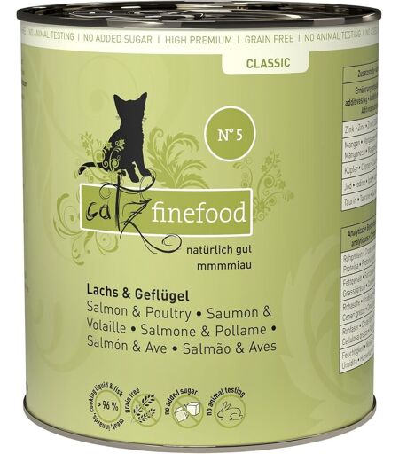 Catz finefood Développé par des experts en nutrition et des vétérinaires notre nourriture humide est un aliment complet avec un mélange optimal de nutriments et de vitamines, adapté aux besoins de votre chatCatz finefood Le n°5 contient beaucoup de volaille délicate (35 %), de saumon (36 %) et d'ingrédients nutritifs tels que les épinards et les tomates. Garanti sans conservateurs, sans exhausteur de goût et sans colorantsExtra de viande les chats sont carnivores et ont besoin de protéines animales, c'est pourquoi notre nourriture gourmet à haute teneur en viande est composée de viande et d'abats de qualité alimentaire de qualité supérieureFabriqué en Allemagne la viande provient principalement de producteurs régionaux, elle est traitée à l'état frais et conserve presque complètement les ingrédients grâce à une cuisson douce à la vapeurAdapté aux espèces pour le bien-être des animaux, nous renonçons délibérément à des ingrédients de mauvaise qualité (farine d'os, viande moulée, soja, céréales), d'additifs artificiels (attractifs, arômes, sucre) et du génie génétiquePortionnement les boîtes de 200 g sont idéales pour les grands groupes de chats ¿ une boîte par repas. Ainsi, le produit reste toujours frais et optimal en consistance et en odeur. Vos chats seront ravisAmour des chats depuis 20 ans, notre c?ur bat chez catz finefood (fabriqué par Pets Nature, en Allemagne) pour chiens et chats. Avec cette longue expérience, nous vous offrons la meilleure qualité et un service client compétent pour vous - par amour pour les animaux.La livraison depuis la France est prévue dans 5 jours ouvrés, n'hésitez pas à passer votre commande ...