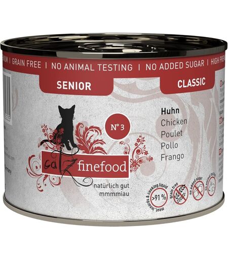 SENIOR qualité catz finefood habituelle avec un goût familier adapté aux besoins liés à l'âge des muselettes grises qui continuent à profiter de leur nourriture préférée sans s'y habituerAdapté à l'âge catz finefood Senior prend en compte les particularités des organes internes liés à l'âge et est parfaitement adapté aux besoins énergétiques et au métabolisme des chats âgésÉquilibré aliment complet pour chats âgés avec une teneur élevée en viande de plus de 91 % ¿ sert à la flore intestinale et à la digestion avec des fibres sur mesure, riche en acides gras essentielsApprovisionnement complet fournit des antioxydants pour protéger les cellules contre les radicaux libres, la L-carnitine pour soutenir le métabolisme des graisses et les vitamines C et E, ainsi que la provitamine bêta-carotène pour le système immunitaireContenu de la livraison 6 boîtes de 200 g de nourriture humide pour poulet catz finefood Classic Senior N°03 de qualité supérieure pour des nez de fourrure vivants et heureux ¿ jusqu'à l'âge avancé.La livraison depuis la France est prévue dans 5 jours ouvrés, n'hésitez pas à passer votre commande ...