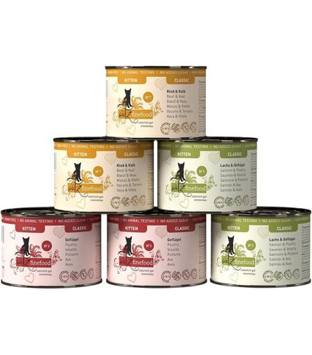 catz finefood Kitten Mix-Pack ¿ Aliment complet pour chats et bébés nous avons adapté nos recettes catz finefood Classic aux besoins des chats en pleine croissanceGOURMET la nourriture humide pour chats pour chats contient 90 % de viande avec décoction de cuisson ainsi que des coquilles d'?ufs comme fournisseurs naturels de calcium, sans additifs artificiels, appâts ou colorantsRespectueux des allergies la nourriture pour chatons pour chatons est hypoallergénique, sans céréales, sans gluten et sans sucre. La consistance de la nourriture est un peu plus fine pour que votre petit chat puisse profiter plus facilementContenu de la livraison vous attendez 6 x 200 g de nourriture pour chat catz finefood Kitten humide dans la boîte avec 2 volailles N°3, 2 x N°5 saumon & volaille et 2 x N°7 b?uf & veau dans un paquet de mélange pratiqueAmour des chats depuis 20 ans, notre c?ur bat chez catz finefood (fabriqué par Pets Nature en Allemagne) pour chiens et chats. Wir bieten Ihnen beste Qualität und kompetenten Kundenservice.La livraison depuis la France est prévue dans 5 jours ouvrés, n'hésitez pas à passer votre commande ...
