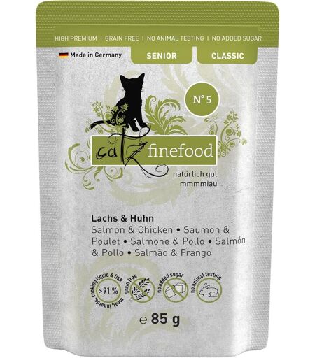 SENIOR qualité catz finefood habituelle avec un goût familier adapté aux besoins liés à l'âge des muselettes grises qui continuent à profiter de leur nourriture préférée sans s'y habituerAdapté à l'âge catz finefood Senior prend en compte les particularités des organes internes liés à l'âge et est parfaitement adapté aux besoins énergétiques et au métabolisme des chats âgésÉquilibré aliment complet pour chats âgés avec une teneur élevée en viande de plus de 91 % ¿ sert à la flore intestinale et à la digestion avec des fibres sur mesure, riche en acides gras essentielsApprovisionnement complet fournit des antioxydants pour protéger les cellules contre les radicaux libres, la L-carnitine pour soutenir le métabolisme des graisses et les vitamines C et E, ainsi que la provitamine bêta-carotène pour le système immunitaireContenu de la livraison 16 boîtes de 85 g de nourriture humide catz finefood Classic SENIOR N°05 de qualité supérieure au saumon et au poulet pour des nez de fourrure vivants et heureux ¿ jusqu'à l'âge avancé.La livraison depuis la France est prévue dans 5 jours ouvrés, n'hésitez pas à passer votre commande ...
