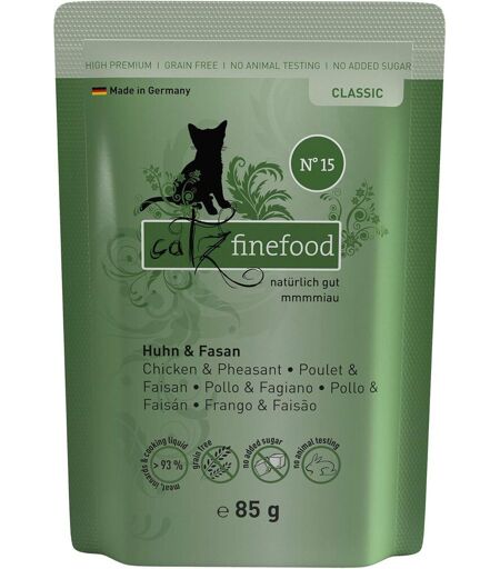 catz finefood La nourriture n° 15 pour chat contient beaucoup de poulet délicat (50 %), du faisan (20 %), du cresson, des minéraux et des pissenlits. Garanti sans céréales, sucre, conservateurs et colorantscatz finefood Développé par des experts en nutrition et des vétérinaires notre nourriture humide est un aliment complet adapté aux besoins de votre chat avec un mélange optimal de nutriments et de vitaminesExtra de viande les chats sont carnivores et ont besoin de protéines animales, c'est pourquoi notre nourriture humide Gourmet avec une teneur en viande supplémentaire est composée de viande et d'abats de qualité alimentaire de qualité supérieureFabriqué en Allemagne la viande provient principalement de producteurs régionaux, elle est traitée à l'état frais et conserve presque complètement les ingrédients grâce à une cuisson douce à la vapeurAdapté aux espèces pour le bien-être des animaux, nous renonçons délibérément à des ingrédients de mauvaise qualité (farine d'os, viande moulée, soja, céréales), d'additifs artificiels (attractifs, arômes, sucre) et du génie génétiqueContenu de la livraison vous recevrez 16 sachets de 85 g pour une alimentation adaptée aux portions ¿ un sachet directement dans la gamelle. L'emballage est peu encombrant et pratique à jeterDepuis 20 ans notre c?ur bat chez catz finefood (fabriqué par Pets Nature, en Allemagne) pour chiens et chats. Avec cette longue expérience, nous vous offrons une qualité idéale et un service client compétent pour vous - par amour pour les animaux.La livraison depuis la France est prévue dans 5 jours ouvrés, n'hésitez pas à passer votre commande ...
