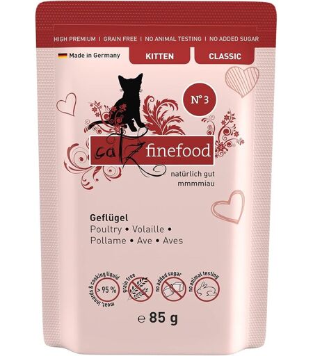 catz finefood Kitten N° 3 Volaille ¿ Aliment complet pour bébés et chats juniors nous avons adapté nos recettes catz finefood Classic aux besoins des chats en pleine croissanceGOURMET la nourriture humide pour chats pour chats contient 90 % de viande avec décoction de cuisson ainsi que des coquilles d'?ufs comme fournisseurs naturels de calcium, sans additifs artificiels, appâts ou colorantsRespectueux des allergies la nourriture pour chatons pour chatons est hypoallergénique, sans céréales, sans gluten et sans sucre. La consistance de la nourriture est un peu plus fine pour que votre petit chat puisse profiter plus facilementContenu de la livraison vous attendez 16 x 85 g de nourriture pour chat catz finefood Kitten humide dans le sac. Jusqu'à ce que la croissance du corps soit terminée, nourrir en petites portions, selon la quantité requise par le chatAmour des chats depuis 20 ans, notre c?ur bat chez catz finefood (fabriqué par Pets Nature en Allemagne) pour chiens et chats. Wir bieten Ihnen beste Qualität und kompetenten Kundenservice.La livraison depuis la France est prévue dans 5 jours ouvrés, n'hésitez pas à passer votre commande ...