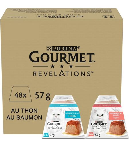 48 x 57 g de mousselines au thon et au saumon pour chat adulte GOURMET REVELATIONSAlimentation 100 % complète et équilibrée pour chats adultes48 portions Individuelles servies en pots de 57g pour que chaque repas reste frais et pratique à servirDes mousselines délicates et raffinées nappées de Sauce élaborée avec des Ingrédients de Haute qualitéSans colorants, sans conservateurs et arômes artificiels ajoutés.La livraison depuis la France est prévue dans 5 jours ouvrés, n'hésitez pas à passer votre commande ...