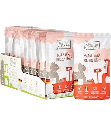 Alimentation humide pour chat - Pourcentage de viande très élevé - Vitamines et minéraux essentiels - Sans céréalesPour nos repas, nous utilisons principalement des ingrédients issus des fermes de la régionMjAMjAM - Tout simplement parce que c'est bonNous y renonçons céréales ni gluten, sucre, conservateur artificiel, lactoseComposition Viande et abats 99 % (b?uf viande et c?ur, poulet foie et c?ur), minéraux 1 %.La livraison depuis la France est prévue dans 5 jours ouvrés, n'hésitez pas à passer votre commande ...