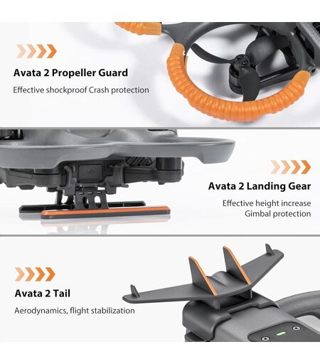 Accessoires 3-en-1 Avata 2 STARTRC Avata 2 Propeller Guard, Landing Gear, Tail spécialement conçus pour DJI Avata 2 Fly More Combo. Ils offrent une protection plus complète et des améliorations esthétiques visuelles pour améliorer votre expérience de vol. Rendez votre drone Avata 2 durable et prolongez sa durée de service (à l'exclusion du drone).Protège-hélices Avata 2 les protecteurs d'hélices Avata 2 en matériau TPU, de conception en forteresse, sont efficaces pour atténuer les impacts et éviter les collisions accidentelles avec les personnes. Protégez votre drone Avata 2 des collisions avec des arbres, des murs ou d'autres obstacles. Un accessoire de base Avata 2 pour les joueurs débutants.Position luminescente Le garde-hélice fluorescent orange personnalisé pour le drone AVATA 2 est en matériau fluorescent de haute performance. Après exposition à une forte lumière, plus la lumière est forte, plus la luminescence est brillante la nuit, ce qui permet de localiser rapidement et avec précision la position du drone, en vous offrant une garantie de sécurité et de fraîcheur pour votre vol nocturne.Train d'atterrissage AVATA 2 Le train d'atterrissage AVATA 2 peut augmenter efficacement de 22 cm. Lorsque le drone décolle ou atterrit sur un terrain inégal, il peut réduire l'impact, faire atterrir le drone en douceur, augmenter la distance du drone au-dessus de la boue, du sable, de l'herbe et protéger le corps du drone Avata 2 et la caméra cardan des dommages.Queue AVATA 2 La conception de queue unique optimise les performances aérodynamiques, réduit la résistance au vol et améliore la stabilité et la maniabilité en vol. La conception extérieure profilée rend votre Avata 2 encore plus accrocheur, rendant chaque vol plus beau à regarder.Ce que vous obtenez 4 pièce de protège-hélices, 1 pièce de train d'atterrissage, 1 pièces de queue pour le combo pour DJI Avata 2 Explorer (à l'exclusion du drone)."".La livraison depuis la France est prévue dans 5 jours ouvrés, n'hésitez pas à passer votre commande ...