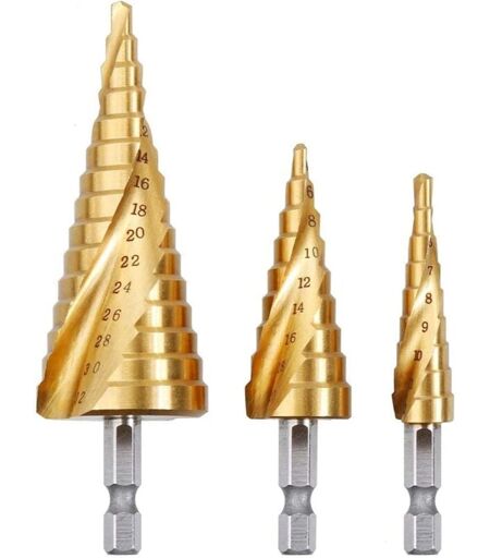 TRIOMPHE 3PCS Foret Fraise Meche Etage, hss Inox Metal, 4-12/20/32mm, Triangle Conique Titane, avec Tige Hexagone, Pour Visseuse Percage sur Acier, Laiton,