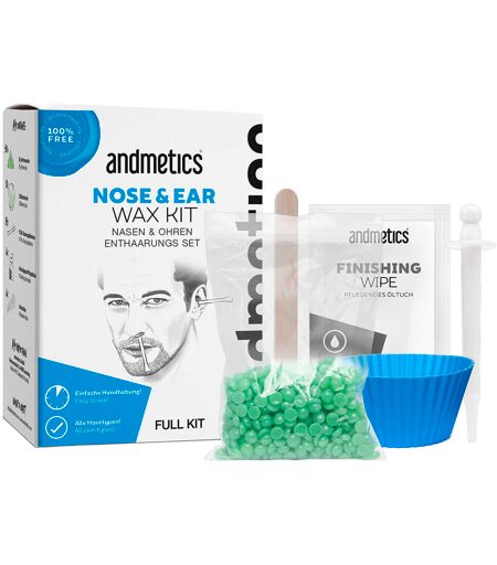 L'avenir de l'épilation du nez à faire soi-même ! Avec les bandes de cire andmetics NOSE & EAR, il n'a jamais été aussi facile de se débarrasser des poils gênants du nez et des oreilles. Le kit NOSE & EAR Wax contient : 50 g de cire en perles2 pcs. godets en silicone15 pcs. Applicateur pour le nez4 pcs. Bâtonnets en bois4 pcs. Lingettes nettoyantes Notre cire est idéale pour une élimination sûre, rapide et durable des poils disgracieux. La cire hypoallergénique spécialement conçue pour le nez et les oreilles te permet d'éliminer en quelques minutes tous les poils indésirables du nez et des oreilles. L'applicateur Safety spécialement conçu garantit que tu n'entres dans le nez / les oreilles que dans la mesure où cela est vraiment prévu. Il s'insère exactement dans le nez/les oreilles pour n'enlever que les poils longs et visibles, sans toucher aux poils importants, situés au fond du nez/des oreilles. L'application est rapide et facile : il suffit de chauffer la cire et de l'appliquer à l'entrée du nez et des oreilles avec l'applicateur Safety. En un peu plus d'une minute, la cire durcit et adhère aux poils indésirables. D'un coup, tu peux dire "au revoir" à la croissance sauvage. Et le meilleur : les poils sont enlevés à la racine et repoussent en douceur jusqu'à 4 semaines plus tard. Ouvre le nez ! Ouvre tes oreilles ! Sens-toi libéré, respire profondément & profite d'une incroyable sensation de fraîcheur ! ...