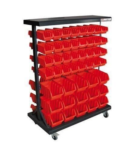 Description générale Cette étagère en tôle métallique est recouverte de peinture en poudre électrostatique, offrant une solution de rangement robuste et durable. Elle est composée de 94 bacs de rangement, incluant 30 grands bacs de dimensions 240 x 150 x 125 mm et 64 petits bacs de dimensions 165 x 105 x 75 mm. Les bacs, très résistants, sont fabriqués en plastique rouge, et l'étagère est conçue pour une utilisation universelle, idéale pour organiser votre atelier ou votre garage. Grâce à ses roulettes, le déplacement est facilité et les bacs sont amovibles individuellement. Spécifications techniques Dimensions de l'étagère (L x P x H) : 940 x 590 x 1250 mm Dimensions des grands bacs : 240 x 150 x 125 mm Dimensions des petits bacs : 165 x 105 x 75 mm Poids net : 33 kg Colisage 1 (structure métallique) : 1120 x 520 x 110 mm Colisage 2 (bacs) : 810 x 360 x 470 mm Compatibilité et accessoires Compatible avec divers outils et accessoires de rangement Bacs amovibles pour un rangement ...