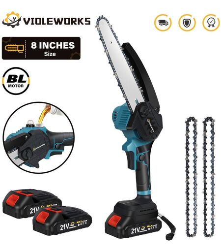 INSMA Tronçonneuse à batterie scie à chaine scie à buche élagueuse VIOLEWORKS 8'' 18V Sans batterie avec 2 chaines (Version améliorée)