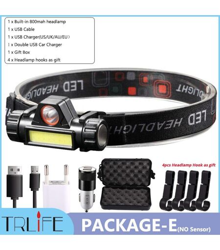 Emballage E-800mah - Mini Lampe Frontale Portable À Led Cob Intégrée, Alimentée Par Capteur, Rechargeable Par Usb, Idéale Pour Le Camping, 2400mah