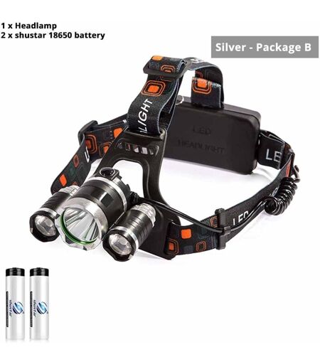 Emballage B-Silver - Lampe Frontale Étanche À 3 Led, 4 Modes D'éclairage, Alimentée Par 2 Piles 18650, Idéal Pour La Pêche Ou Le Camping