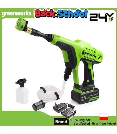 Découvrez le lave-high pressure à main puissant de Greenworks.Il est équipé d’un moteur en cuivre pur et d’une batterie à grande capacité, conçu pour répondre à tous vos besoins de nettoyage. Il convient particulièrement au lavage de véhicules, au nettoyage de jardin et à d’autres applications domestiques. Spécifications techniques: Tension : 24 V Moteur : Moteur sans balais Niveaux de pression : 2 (deux) Pression : 24 BAR Débit d’eau : 180 litres/heure Longueur du tuyau d’eau : 6 mètres Compatibilité et accessoires Accessoires inclus : Perche extensible, buse à 0°, buse 5-en-1 Emballage : 1 × lave-high pressure à main, 1 × bouteille à mousse, 1 × tuyau d’eau de 6 mètres, 1 × perche extensible, 1 × batterie lithium-ion de 4 Ah, 1 × chargeur Usages: Lavage de véhicules/Nettoyage de jardin/Nettoyage de fenêtres et de portes/Arrosage des plantes intérieures/Bain des animaux domestiques/Nettoyage des cultures agricoles Attention: Veuillez charger complètement la batterie avant la première ...