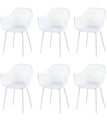 Dimensions des chaises de salle à manger : 52 x 56 x 84.5 cm Les assises sont fabriquées en plastique polypropylène de coloris blanc. La structure du piétement est composée de 6 pieds solides en métal laqué blanc. Utilisables comme chaises de salle à manger ou chaises de cuisine, ou bien comme fauteuils dappoint dans une chambre, une entrée ou un bureau. Les sièges sont en forme de coque enveloppante avec accoudoirs et la structure du dossier en grillage, marquée par une architecture en losanges, apportera une touche de design scandinave en plus dans votre intérieur! Ces chaises sadapteront à nimporte quelle table et décoration, que ce soit dans votre salle à manger ou votre cuisine. ...