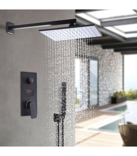 Description Les bébés et les personnes âgées sont sensibles à la température de l'eau, ce qui peut facilement entraîner des troubles physiques. L'eau dans plusieurs salles de bains et dans la cuisine provoque une instabilité de la température de l'eau. La possession de cette douche numérique permet de résoudre tous ces problèmes. Elle apporte plus de soins à vous et à votre famille. Principales caractéristiques Matériau premium : il est composé de cuivre et d'acier inoxydable de haute qualité avec une surface laquée au four qui peut prévenir efficacement la corrosion et la rouille et garantir une longue durée de vie et une qualité d'eau sûre. Aspect délicat : Le design moderne du kit de douche encastré noir donne à votre salle de bains un aspect plus moderne et plus élégant, qui peut être intégré dans une grande variété de styles d'habitat. Réduire le stress : Le grand pommeau de douche de 12 pouces peut couvrir tout le corps dans la douche grâce à la technologie Air Booster, rincer ...